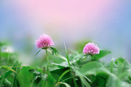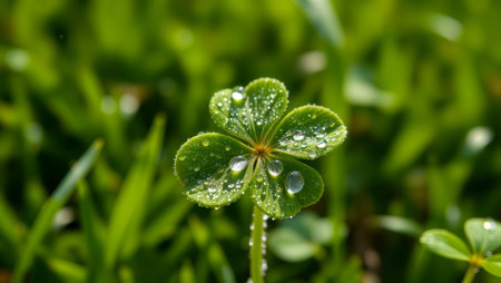 Delicate dewdrop on a lush green four-leaf clover in the morning sun. Natural floral background with copy space. Selective focus. Blurred background with beautiful bokeh.