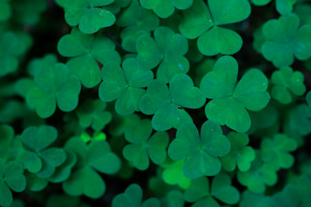 Close up shamrock clovers meadow concept photo. Three leaf plants with dark center. Front view photography with blurred background. High quality picture for wallpaper, travel blog, magazine, article