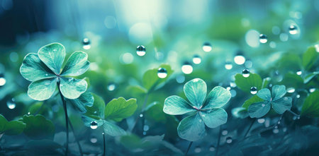 Green four leaf clover, rare fourleaf nature spring leaves floral background with water drops, good luck shamrock and lucky charm fortune, prosperity concept, Saint Patricks Day symbol.