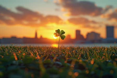 happy saint Patrick's day leaf shamrock clover close up with evening sunset in background. AI genrative.