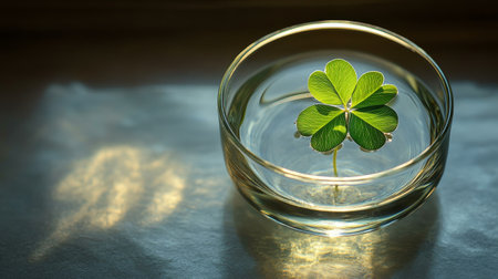A glass bowl holds several fresh green clovers submerged in clear water, creating a visually appealing centerpiece perfect for home decor or nature-inspired arrangements.