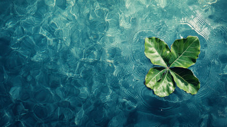 A vibrant green leaf gracefully floats on a clear water surface, creating a serene image. The gentle ripples enhance the tranquil mood and beauty of nature.