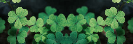 Macro shot of clover bushes, beautiful three-leaf clover. Green nature background long banner blurred, unfocused photo