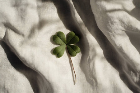 A close up view of a vibrant green four leaf clover resting on soft, white linen fabric, symbolizing luck and hope, ideal for spring and nature themed concepts