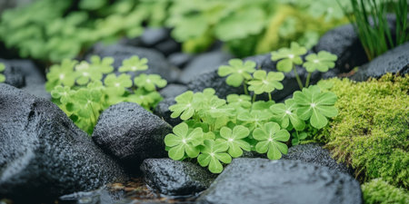 Green Clover Plants Thriving Among Black Stones, Close Up View, Greenery, Nature Concept