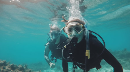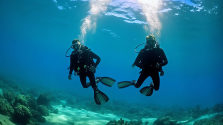 Two divers swimming underwater. Generative AI