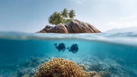 Two divers are exploring a vibrant coral reef in crystal clear turquoise water near a small tropical island with palm trees and rock formations, creating a breathtaking split level view of paradise