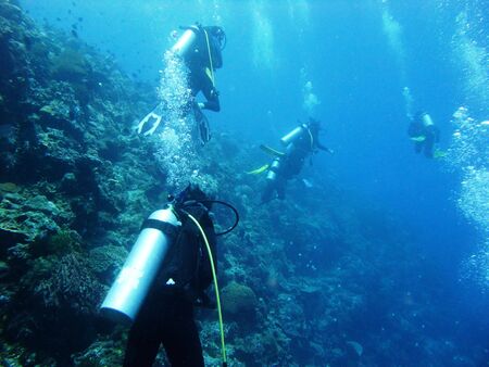 Group of divers Underwater background.