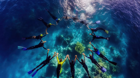 An aerial view of a group of divers forming a circle in crystal-clear water above a coral reef, highlighting adventure and marine beauty with dynamic colors and sunlight.