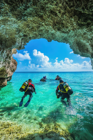 Scuba divers exploring beautiful tropical ocean, entering through rock arch