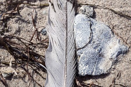 feather in the sand, a symbol of truth and lightness, the element of wind and air, blur close-up