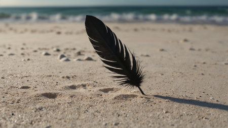 Black feather standing upright on white sand. Representing balance, fragility, or a single thought among silence. Copy space.