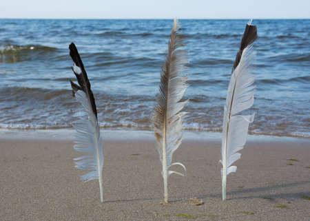 Feather of a bird in the foreground Seascape. Sandy beach, clear day