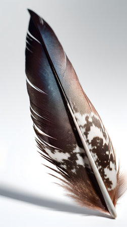 Single patterned bird feather, brown and white, dramatically lit and isolated against a deep black background. high contrast studio shot symbolizing nature, freedom, and spirituality.