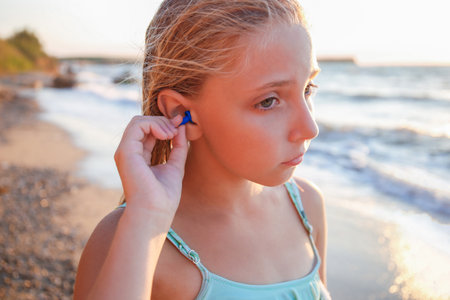 A girl with earplugs from water in her ears on the beach.