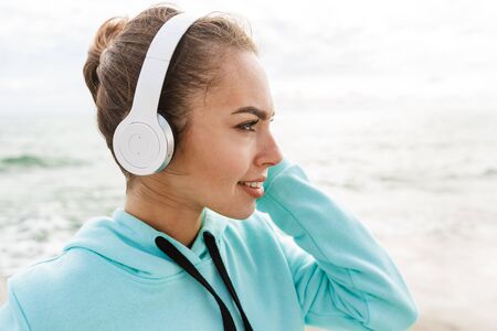 Close up of laughing young sportswoman at the seaside, listening to music with earphones