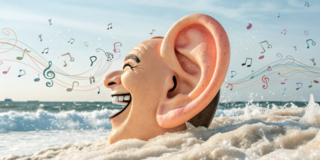 A giant ear sculpture with a smiling face emerges from the waves at the beach, surrounded by playful musical notes floating in the air under a bright sky.