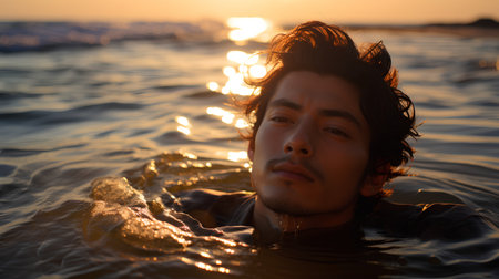 Portrait of a young Asian man in the water at sunset.