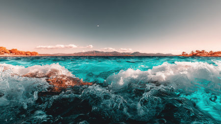 This captivating image showcases foamy waves rolling up the ocean shoreline under a brilliant sky, illustrating natures beauty and the soothing yet dynamic power of the sea as it endlessly meets