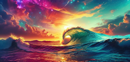 A mesmerizing rainbow-colored ocean wave curling against a serene backdrop of a setting sun. The tranquil sea reflects soft pastel hues, creating a dreamy atmosphere.