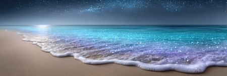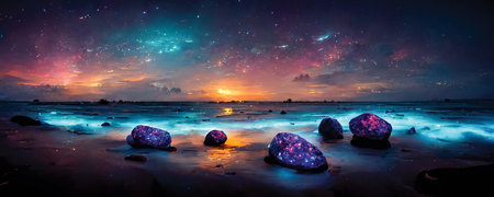 Fantasy night seascape, glowing marine life, starry sky, digital art