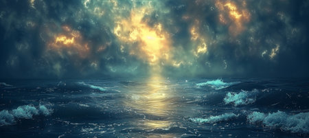 Breathtaking ocean view with sunlight streaming through dark clouds, creating serene atmosphere. gentle waves reflect light, enhancing tranquil beauty of seascape