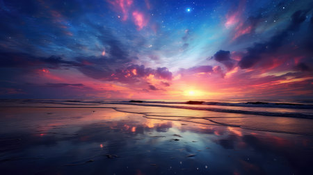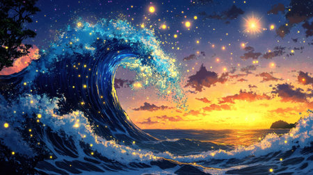 This stunning image captures a magnificent ocean wave illuminated by a captivating sunset and twinkling stars, creating a magical atmosphere in nature.