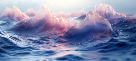 Waves roll across the ocean with bright colors, reflecting the beauty of nature under a cloudy sky.