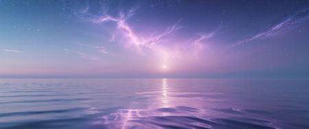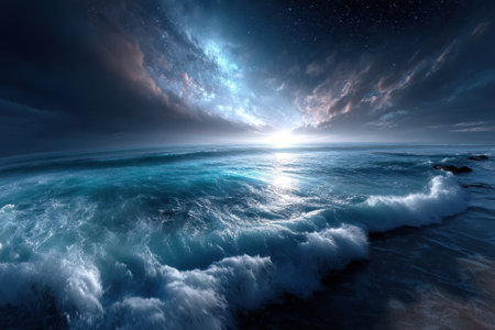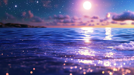A captivating view of a calm ocean illuminated by a bright moon and shimmering stars. Gentle waves reflect the serene atmosphere of twilight, creating a peaceful landscape.