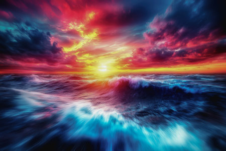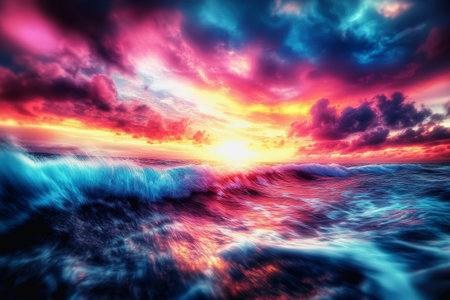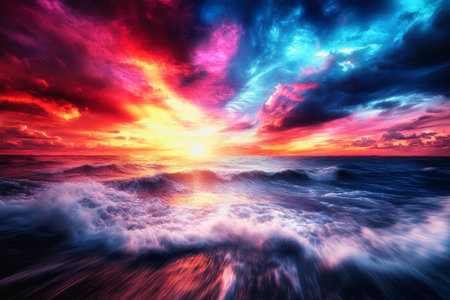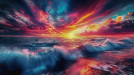 Vibrant sunset over a crashing ocean, blending vivid colors with dramatic clouds.