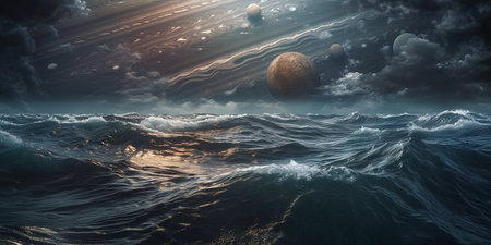 Open ocean space with raging waves on an unknown planet overlooking a futuristic horizon with planets and space. AI generated, AI generative, AI generativ.
