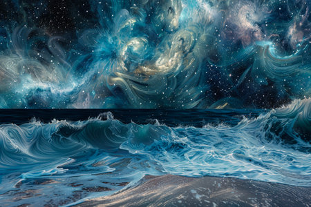A stunning turquoise wave breaking under a starry cosmic sky background.