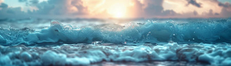 Close up of a powerful sea wave with white foam splashing on the shore. A beautiful and serene sunset with a cloudy sky illuminates the tranquil ocean scene.