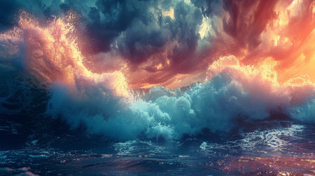 Dynamic ocean scene with vibrant sunset, swirling clouds, and crashing waves.