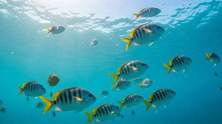 A school of striped fish swims in clear blue ocean water with sunlight Clear details and vibrant colors enhanc...
