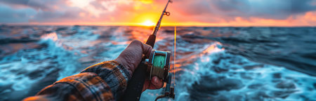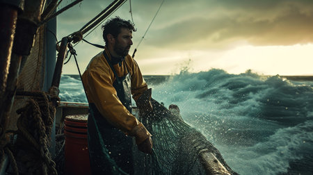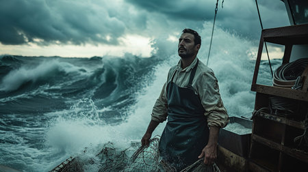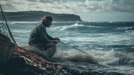 Seasoned fisherman at sea, capturing the essence of marine life and early morning fishing.
