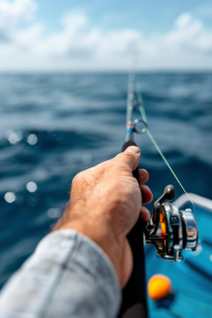 A person holds a fishing rod while casting into the deep blue ocean on a sunny day, surrounded by clear skies and gentle waves.