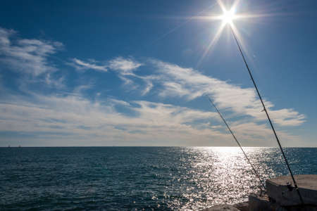 Little boy throws a fishing rod from the pier into the sea. Natural natural composition