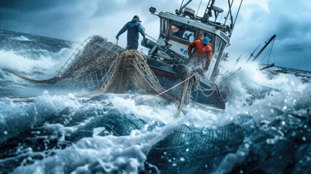 A rugged fishing boat cuts through turbulent ocean waves under a dramatic overcast sky, showcasing the resilience of maritime workers. AIG41