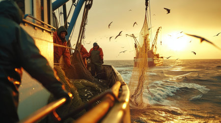 A team of fishermen in orange overalls works together on a fishing boat at sunrise, hauling a large net full of silver fish. The sun is rising on the horizon, casting a warm glow over the water and the boat.