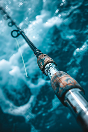 Close-up, Underwater Perspective Showing Fishing Rod Being Cast into Wavy Deep Blue Water