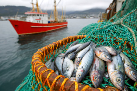 A top view of a fishing boat with nets and catch visible, with a clean, unobtrusive background for adding text.