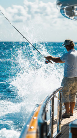 Fisherman aboard his yacht reeling in his line with ocean spray in the background