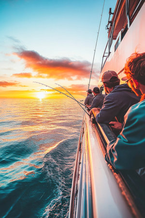 Group of friends are enjoying a deep sea fishing trip at sunset on a yacht
