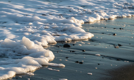 White foam texture on beach waves, soft and bubbly, blending into sandy tones of the shoreline