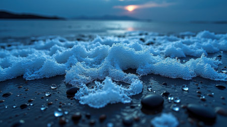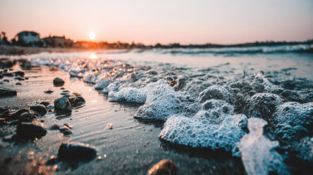 A serene coastal scene with textured white sea foam covering wet sand and pebbles. The warm light of the setting sun glows on the horizon, creating a peaceful atmosphere.