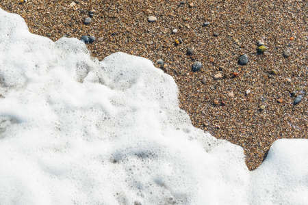 Close Up Wave Sand Beach Sea Foam. Closeup of sea wave with foam on beach sand. Vacation Summer background