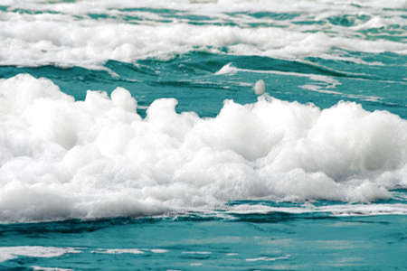 water pollution, white foam in the ocean and sea close-up