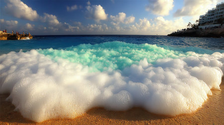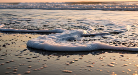 A low angle view of fluffy white sea foam on a golden sand beach. The clear turquoise water and a cloudy sunset sky create a serene and picturesque coastal scene.