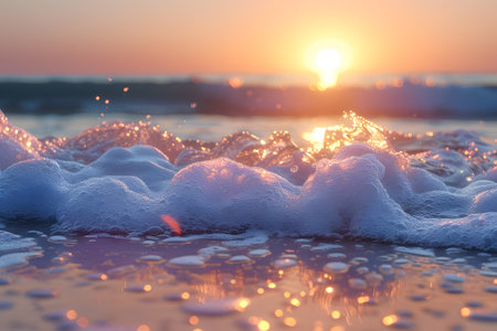 A close-up view of white sea foam washing onto a sandy beach, illuminated by the golden light of a setting sun. The texture of the bubbles and the wet sand creates a detailed and calming coastal scene.